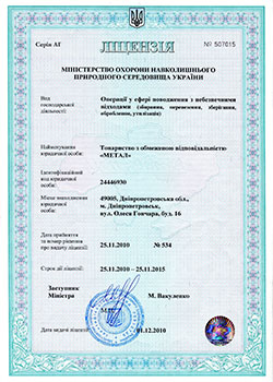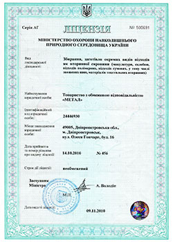 - Ліцензія збір, заготівля окремих видів відходів як вторинної сировини АГ №500691, термін дії необмежений;