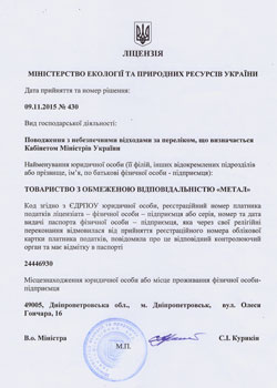 - Дозвіл на заготівлю брухту кольорових металів: АКТ-обстеження №48/17 від 13.07.17 виданий Дніпровською ОДА, термін дії необмежений;